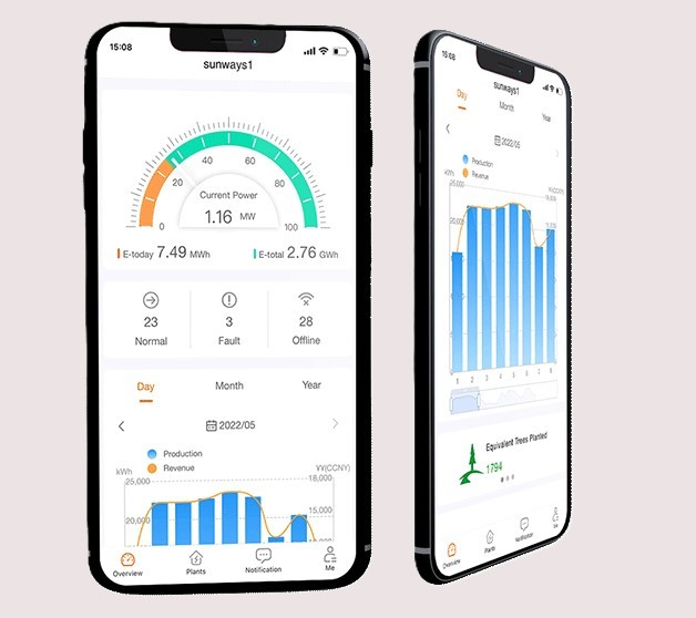 Sunways egenutvecklade övervaknings-app används för att ge användarna korrekt och heltäckande dataanalys och fellarm av sina anläggning när som helst och var som helst, för att göra produkternas drift mer stabil och pålitlig, och för att förverkliga en stabil och intelligent drift- och underhållshanteringstjänster.